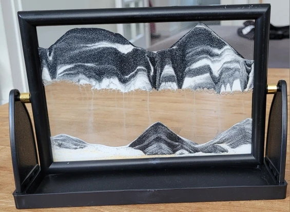 This captivating piece features a square glass frame filled with colored sand and liquid, creating dynamic 3D landscapes that shift and evolve as you rotate the frame. Watch as mountains, valleys, and dunes form before your eyes, offering a moment of relaxation and visual delight.